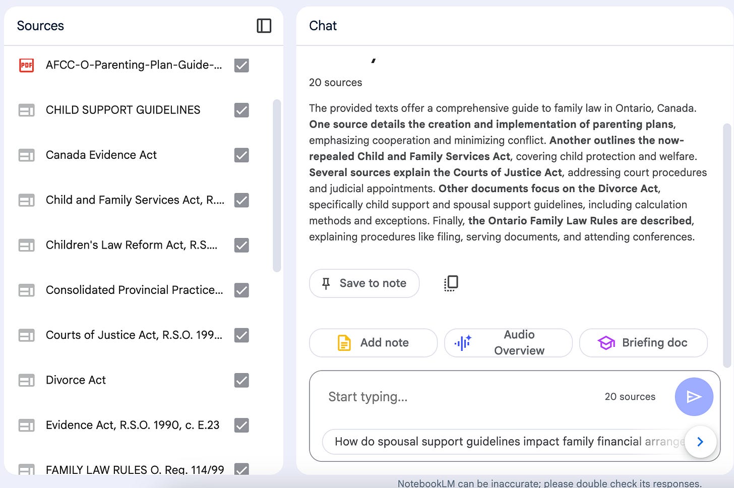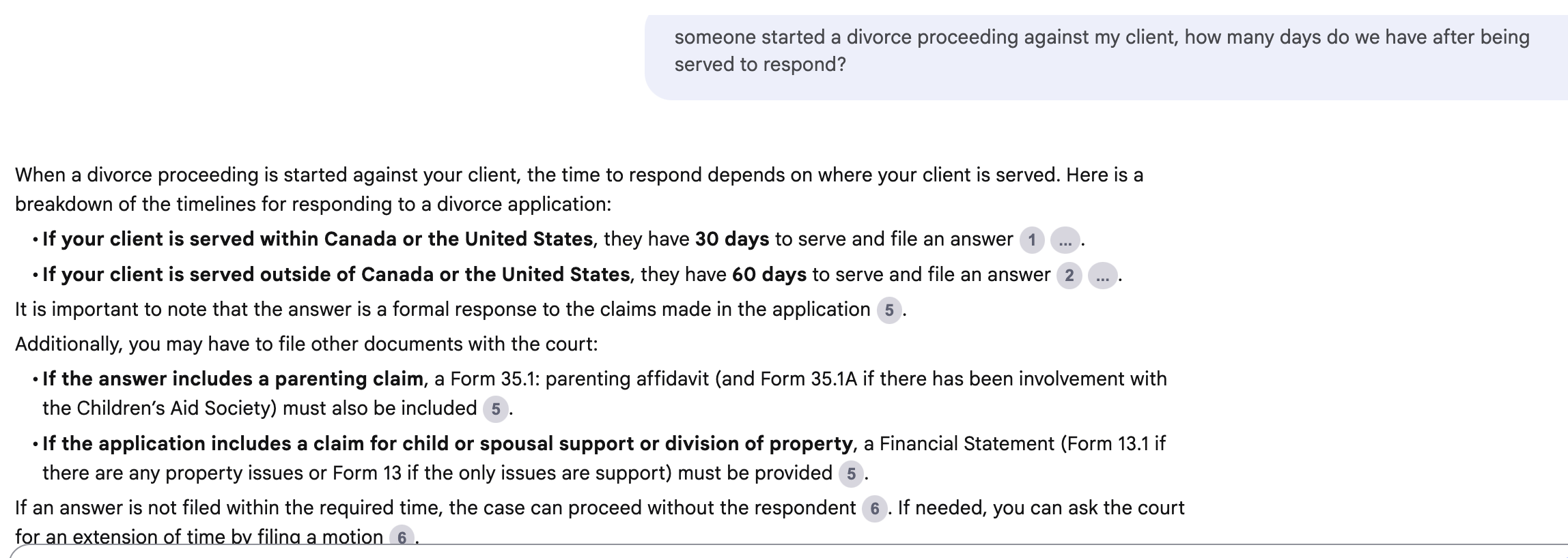 The above is just an example of a very easy question that most family law experts would know, but for newbies or for much more complex questions, not only is this a great way to get quick answers, it also highlights the specific source(s) so you know where to go to do further research or double check (because I always, always double and triple check the answers. Remember: AI is a tool, not a replacement for doing the work properly).